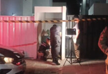 Em um apartamento localizado no bairro Aparecida, os policiais encontraram expressiva quantidade de drogas sendo 94 porções de maconha (239 gramas); 10 sacos de substância conhecida como “ice”, contendo 100 unidades (105 gramas); 01 porção de haxixe em pasta (0,025 grama) e 34 frascos de lança-perfume, cada frasco de 50 ml, pesando 1,354 kg.