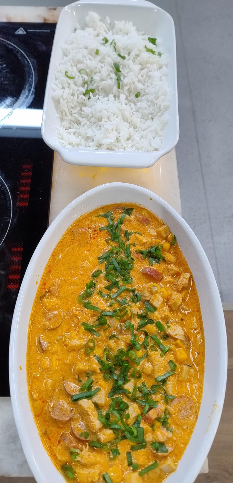 Na sequência, adicione o molho de tomate e deixe apurar. Por último, o creme de leite, a salsinha e cebolinha. Agora é só saborear um clássico dos brasileiros.