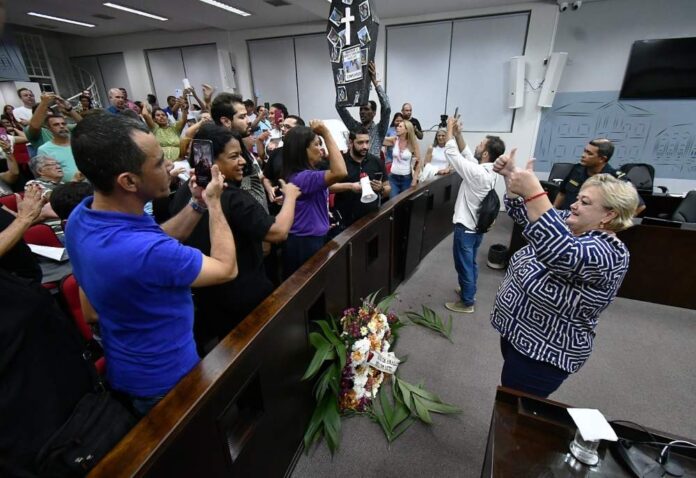 Logo no início da sessão, durante a leitura de documentos, os manifestantes começaram a se manifestar, pedindo a instauração da CPI. A presidente da Câmara, Cristina Munhoz (UB), suspendeu a sessão por 20 minutos devido à impossibilidade de manifestações da galeria, conforme o regimento interno.