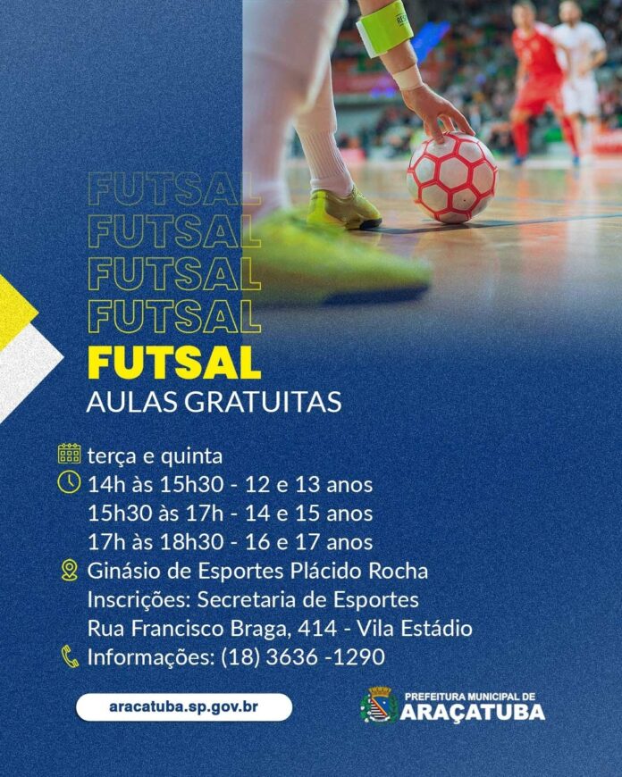 A Prefeitura de Araçatuba, através da Secretaria Municipal de Esportes, Lazer e Recreação (SMELR), está lançando um programa de aulas gratuitas de futsal para jovens da cidade. As atividades serão realizadas no Ginásio de Esportes Plácido Rocha, com início previsto para o dia 21 de março.