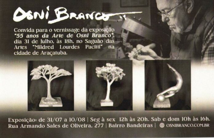 A exposição “55 anos da arte de Osni Branco” começa nesta quarta-feira (31) e vai até 10 de agosto no Complexo Cultural Bandeiras. O espaço, que inclui o Teatro “Paulo Alcides Jorge”, a Biblioteca Pública Municipal “Rubens do Amaral” e o Saguão das Artes “Mildred Lourdes Pacitti”, sediará o evento.