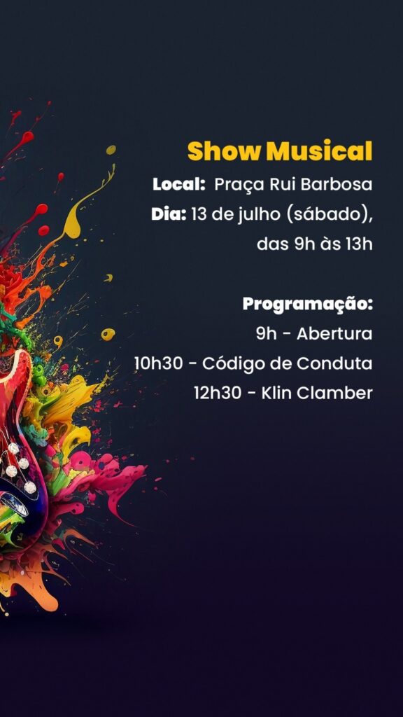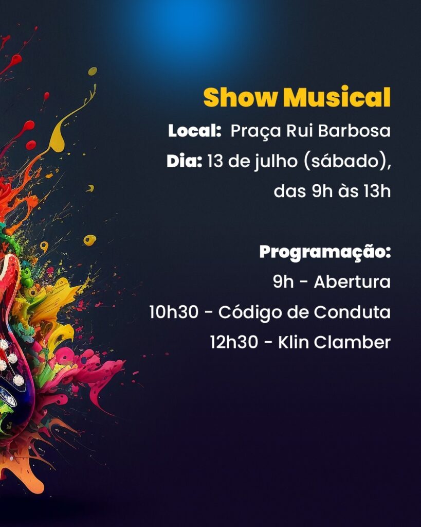 Em comemoração ao Dia do Rock, celebrado mundialmente em 13 de julho, a Prefeitura de Araçatuba, por meio da Secretaria de Cultura, realizará dois shows neste sábado (13) na praça Rui Barbosa. A programação vai das 9h às 13h, com apresentações da Banda Código de Conduta às 10h30 e Klin Clamber and Fools às 12h30.