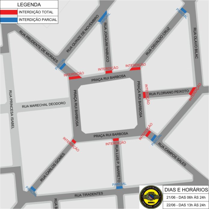 As interdições afetarão todas as ruas com acesso direto à praça Rui Barbosa, com trechos imediatamente adjacentes ao evento sendo parcialmente fechados. As vias afetadas incluem as ruas Carlos Gomes, Luis Pereira Barreto, Campos Salles, Osvaldo Cruz, Joaquim Nabuco e Prudente de Morais. Já a rua Floriano Peixoto terá interdição total durante o período mencionado.