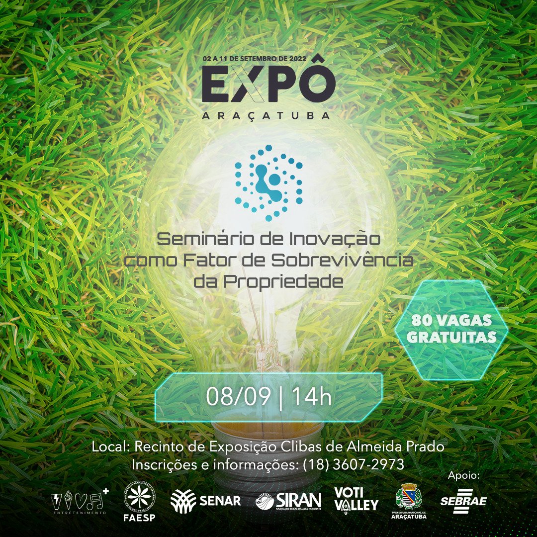 Estão abertas as inscrições para capacitações que serão realizadas durante a Expô Araçatuba 2022, no auditório do Sindicato Rural da Alta Noroeste (SIRAN), no Recinto de Exposição Clibas de Almeida Prado, em Araçatuba (SP). A ação é realizada pelo Sebrae-SP em parceria com o SIRAN, Viva + Entretenimento, Faesp/Senar e Secretaria Municipal de Desenvolvimento Agroindustrial de Araçatuba (SMDA). São 380 vagas para cursos, palestra, seminários e fórum nos segmentos de agronegócio, turismo, artesanato, inovação e liderança feminina. As inscrições são gratuitas.