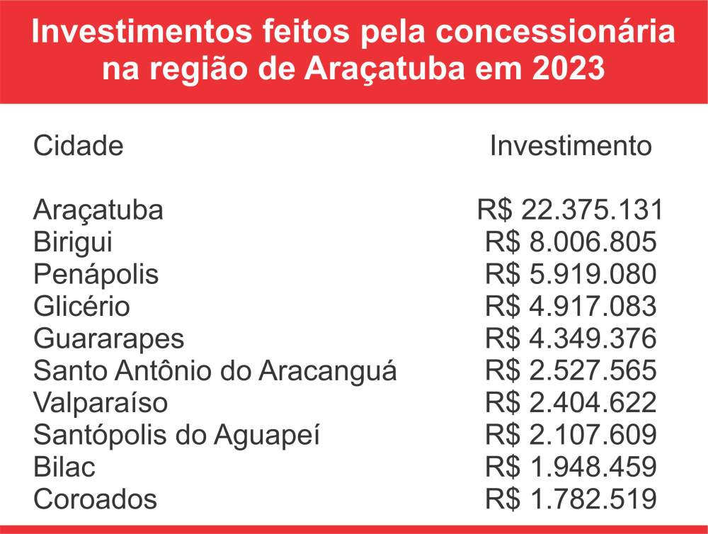 Em Araçatuba, foram aplicados mais de R$ 22 milhões em 2023, principalmente em ações para dar suporte ao crescimento de mercado. Além disso, cidades como Birigui, Penápolis, Glicério e Guararapes também receberam investimentos significativos da concessionária.