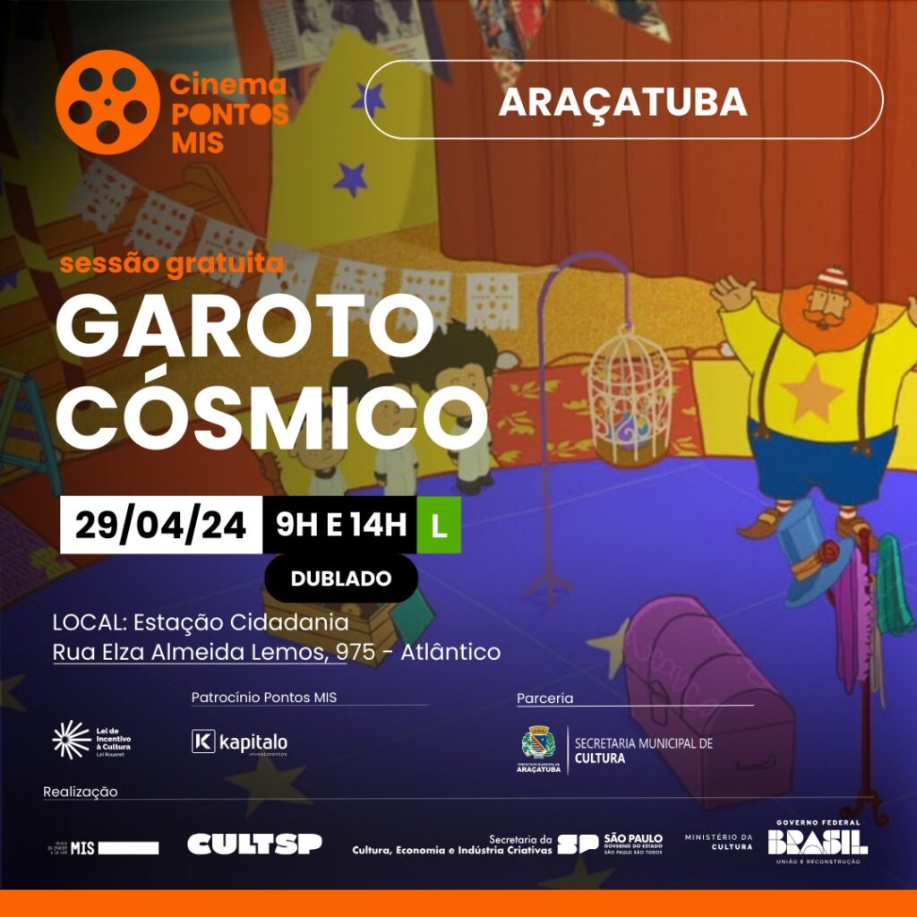 A Secretaria Municipal de Cultura de Araçatuba, em conjunto com o programa estadual Pontos MIS, promoverá a exibição de dois filmes durante o mês de abril. O primeiro filme, intitulado “Perdidos em Paris”, será apresentado no dia 22, com sessões às 14h e 19h, no Teatro Castro Alves. Já a animação nacional “Garoto Cósmico” será exibida em 29 de abril, com sessões às 9h e 14h, no Estação Cidadania.