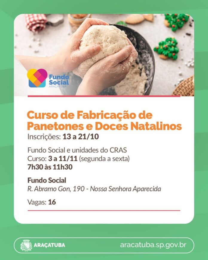 13/10/2025 – O Fundo Social de Solidariedade (FSS) de Araçatuba e o Sebrae-SP estão com inscrições abertas para mais um curso gratuito: “Fabricação de Panetones e Doces Natalinos”. São oferecidas 16 vagas para pessoas acima de 18 anos que atuem ou desejem empreender na área.