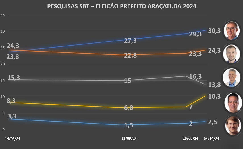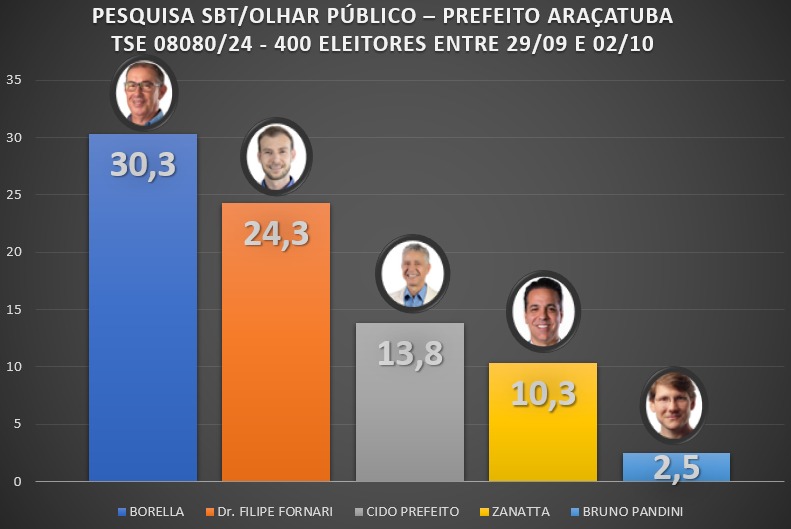 O Instituto Olhar Público divulgou a quarta pesquisa de intenção de voto para as eleições municipais de Araçatuba, encomendada pelo SBT Interior. O levantamento, realizado entre os dias 29 de setembro e 2 de outubro, ouviu 400 eleitores da cidade e tem uma margem de erro de 4,9 pontos percentuais, para mais ou para menos, com um nível de confiança de 95%.