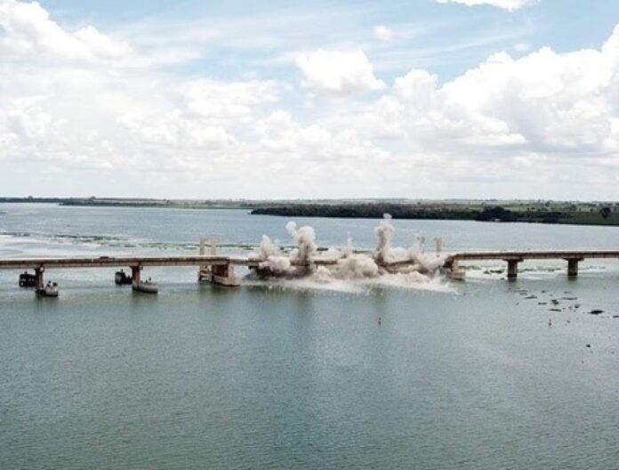 O Departamento de Estradas de Rodagem (DER) implodiu nesta quarta-feira (23) parte da ponte “Prefeito Alidino Valter Bonini”, localizada na divisa entre Barbosa e José Bonifácio, que cruza o rio Tietê. A estrutura, situada no km 262 da rodovia Assis Chateaubriand (SP-425), será parcialmente substituída por uma ponte metálica, com o objetivo de ampliar o vão de navegação de 39 para 110 metros, facilitando o transporte de cargas da Hidrovia Tietê-Paraná.