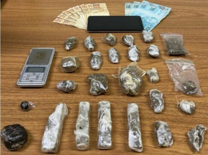 Com autorização da avó do suspeito, os policiais entraram na casa e apreenderam 24 porções de maconha, uma balança digital e R$ 850 em dinheiro. Todo o material estava em cima de uma penteadeira no quarto do investigado. A droga apreendida somou 319,96 gramas, segundo o registro policial.