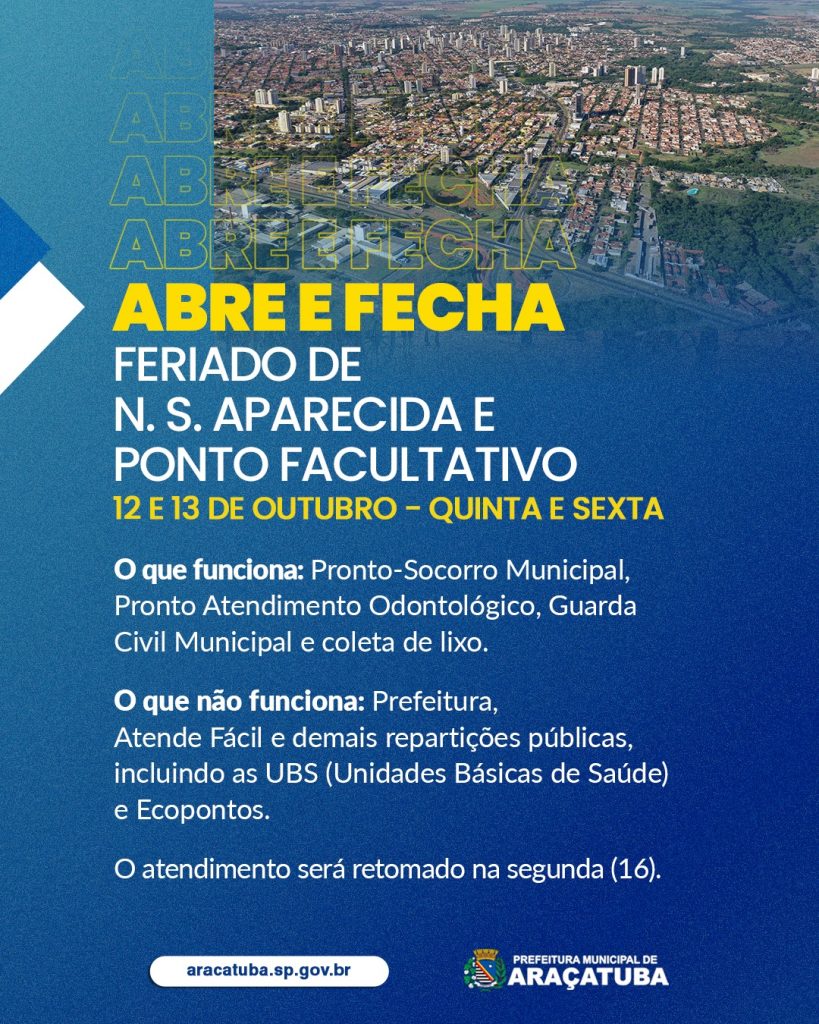 A Prefeitura de Araçatuba decretou ponto facultativo na próxima sexta-feira (13), após o feriado da padroeira Nossa Senhora Aparecida e Dia das Crianças. Com isso, somente os serviços considerados essenciais funcionarão.
