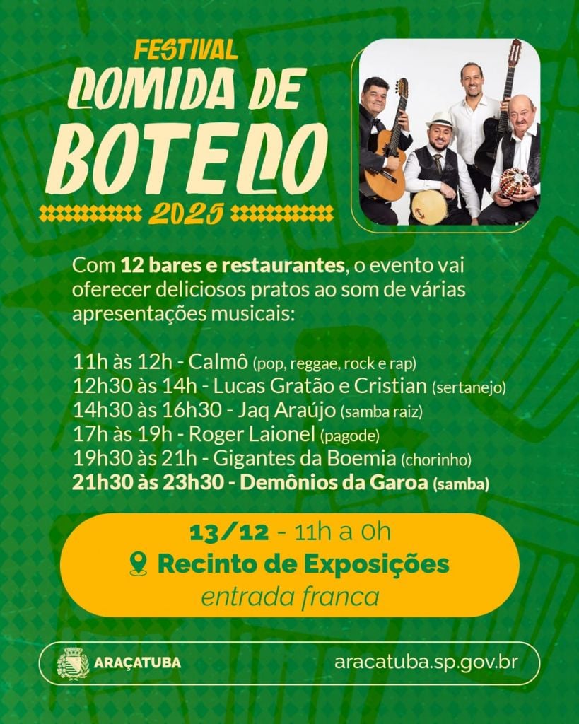 O grupo Demônios da Garoa se apresenta neste sábado (13), em Araçatuba (SP), durante o Festival Comida de Boteco, no Recinto de Exposições Clibas de Almeida Prado, com entrada gratuita. O show está marcado para as 21h30, mas o evento começou às 11h, com a participação de 12 bares e restaurantes,