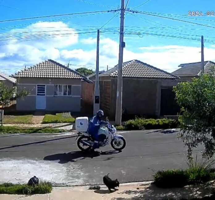 Nas imagens capturadas pelas câmeras de segurança, é possível observar o momento em que o funcionário pega algo no chão e, ao sair com a motocicleta, desfere o objeto, aparentemente uma pedra, contra o animal.
