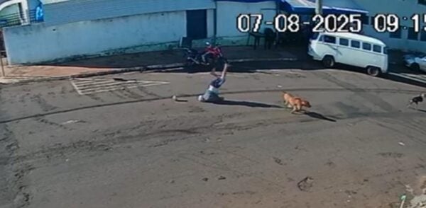 .Câmeras de monitoramento mostram que ele seguia tranquilamente pela rua Zualdo Paganini, no centro da cidade, quando foi surpreendido por dois cães de grande porte, que corriam pela via.