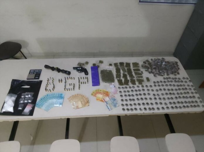 Durante a abordagem, o jovem foi revistado e estava com duas porções de cocaína. Embora tenha negado ter mais drogas em casa, os policiais viram um revólver calibre 38 desmuniciado sobre a estante da sala. Junto com a arma, foram encontradas 35 munições intactas, 25 cápsulas vazias e R$ 1.724 em dinheiro. No quarto do suspeito, foram apreendidos um tijolo de maconha, 142 porções da droga e mais 143 porções em sacos plásticos, somando 2,2 quilos de maconha, além de oito porções de cocaína.