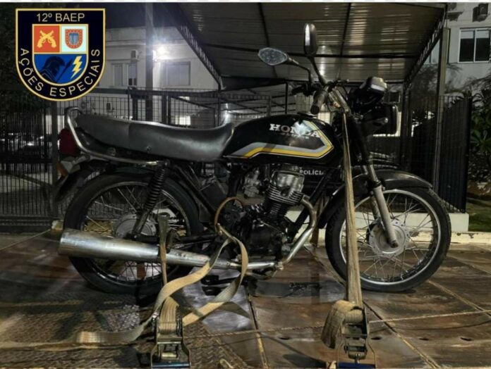 Durante a vistoria, os policiais identificaram diversas irregularidades no veículo, uma Honda CG 125 preta. A placa instalada não estava registrada no sistema do Detran, e o chassi apresentava sinais de adulteração, com a numeração parcialmente raspada. O motor, por sua vez, estava registrado como pertencente a outra motocicleta, de cor vermelha.