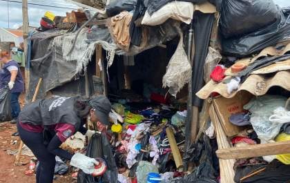 Na segunda-feira, as máquinas também fizeram a limpeza de um terreno ao lado da residência, de onde foi retirada uma grande quantidade de material, enchendo 12 caminhões. Nesta terça-feira, quatro caminhões foram necessários para transportar o material recolhido.