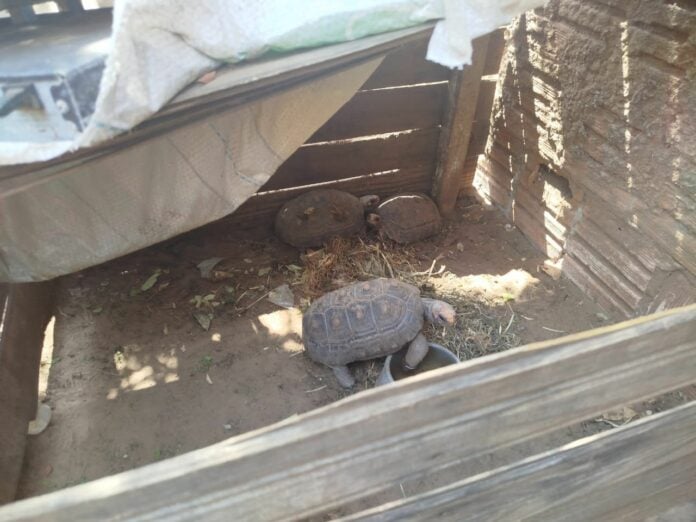 No local foi feito contato com o morador (um homem de 61 anos), que autorizou a equipe a vistoriar sua residência, sendo constatada a existência de três animais silvestres da espécie Jabuti sendo mantidos em cativeiro.