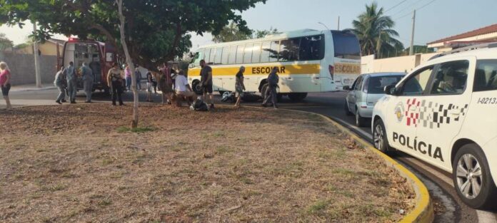 Imagens enviadas por um leitor mostram que a motoneta foi atingida ao fazer a rotatória lado a lado com o ônibus, utilizado para o transporte de estudantes. De acordo com informações preliminares do Corpo de Bombeiros, o chamado foi recebido pouco antes das 7h30.