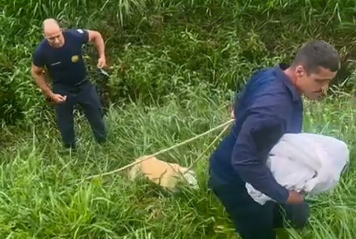 O cachorro apresentava ferimentos, mas foi retirado com segurança e encaminhado para avaliação veterinária.