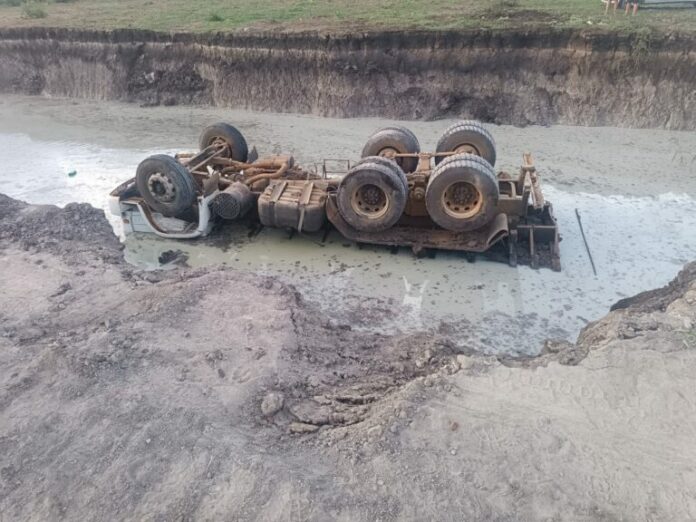 Durante o trabalho, o caminhão tombou em um barranco e caiu em uma lagoa. O jovem ficou preso às ferragens da cabine.