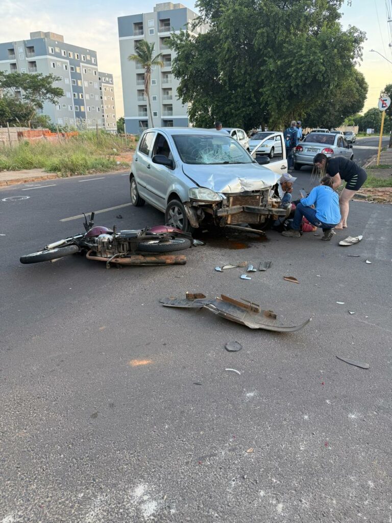 Uma motociclista de 28 anos foi socorrida com múltiplos ferimentos após um grave acidente no início da manhã desta sexta-feira (6), no bairro Abílio Mendes, em Araçatuba (SP). A colisão envolveu a motocicleta que ela conduzia e um carro de passeio.