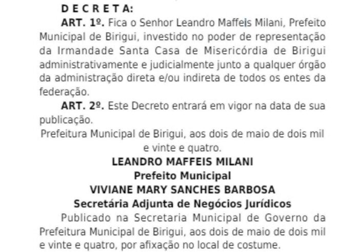 O prefeito de Birigui (SP), Leandro Maffeis (Republicanos), emitiu um decreto nesta quinta-feira (1), se autoatribuindo a função de representar administrativa e judicialmente a Irmandade da Santa Casa perante qualquer órgão da administração direta e/ou indireta de todos os entes federativos.