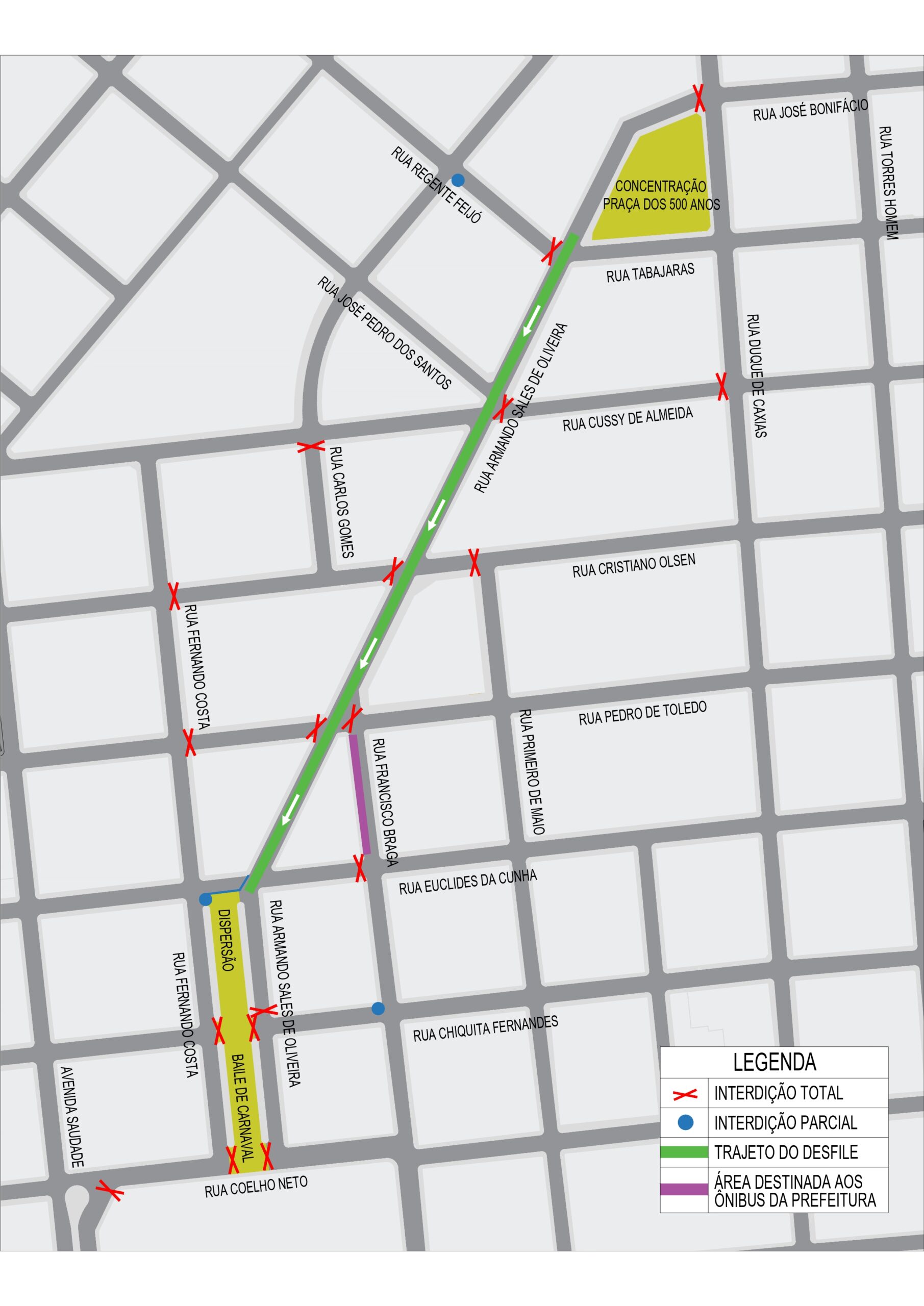 A interdição da Praça Olímpica, entre as ruas Chiquita Fernandes e Coelho Neto, deverá ocorrer a partir do dia 08 de fevereiro, quinta-feira, às 12h, assim permanecendo até o final do baile, dia 10 de fevereiro, sábado, por volta das 23h. Nesse local estará sendo montado o palco e toda a decoração do espaço.