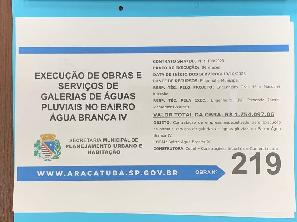 A Prefeitura de Araçatuba (SP) anunciou o início da quarta fase de implantação da rede de galerias no bairro Água Branca. O trabalho abrange o bairro Água Branca 4 e começou após a assinatura da ordem de serviço. A empresa Copel Construções, Indústria e Comércio Ltda está encarregada da execução, com um prazo de 180 dias, o que equivale a seis meses, para a conclusão do projeto.
