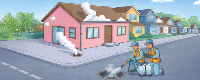 O procedimento consiste em injetar fumaça não tóxica na rede de esgoto para identificar possíveis irregularidades, como ligações cruzadas, quando a água da chuva é direcionada para a rede de esgoto ou o esgoto é lançado na rede pluvial.