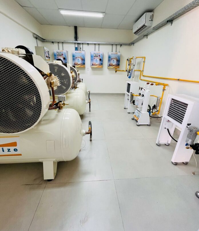 Entrou em operação nesta semana, o novo sistema de geração de ar comprimido medicinal produzido por uma das centrais que integram o complexo da Usina de Geração de Gases da Santa Casa de Araçatuba. O complexo é formado por estrutura para produção própria de insumos essenciais aos quase 320 mil procedimentos médico-hospitalares realizados por ano: oxigênio (O₂) e ar comprimido medicinais, e vácuo clínico.