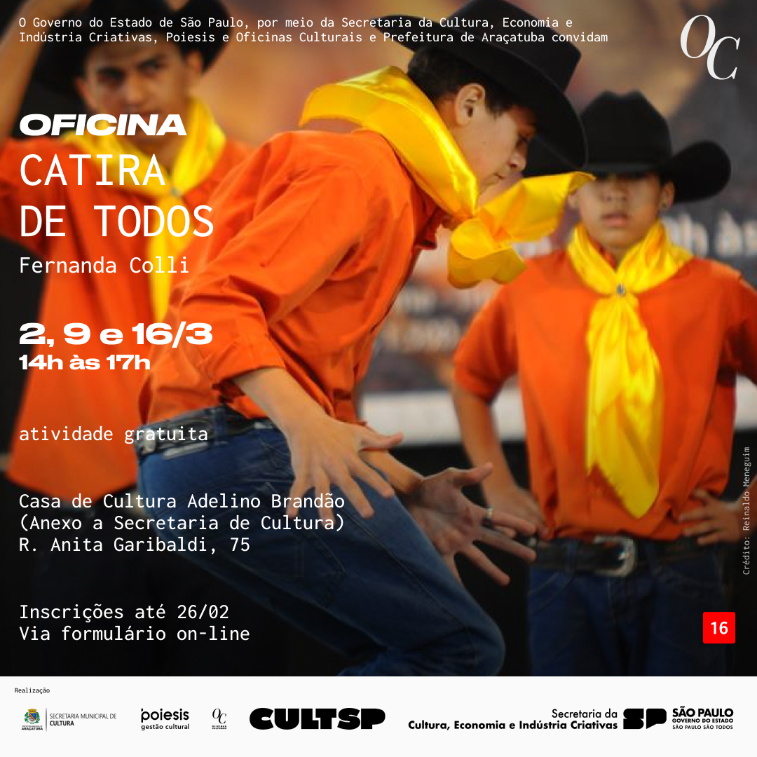 A Secretaria Municipal de Cultura de Araçatuba, em parceria com a Poiesis Organização Social da Cultura e o Programa Oficinas Culturais da Secretaria de Cultura, Economia e Indústria Criativas do Estado de São Paulo, está organizando a Oficina Catira de Todos, uma iniciativa destinada a quem deseja se envolver e preservar a rica cultura regional.