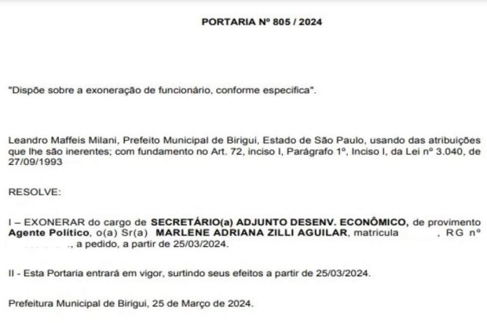 No Diário Oficial de Birigui (SP) desta terça-feira (26), foi publicada a exoneração de Marlene Adriana Zilli Aguilar, secretária adjunta da Secretaria de Desenvolvimento Econômico. A publicação indica que o desligamento foi solicitado pela própria Marlene.