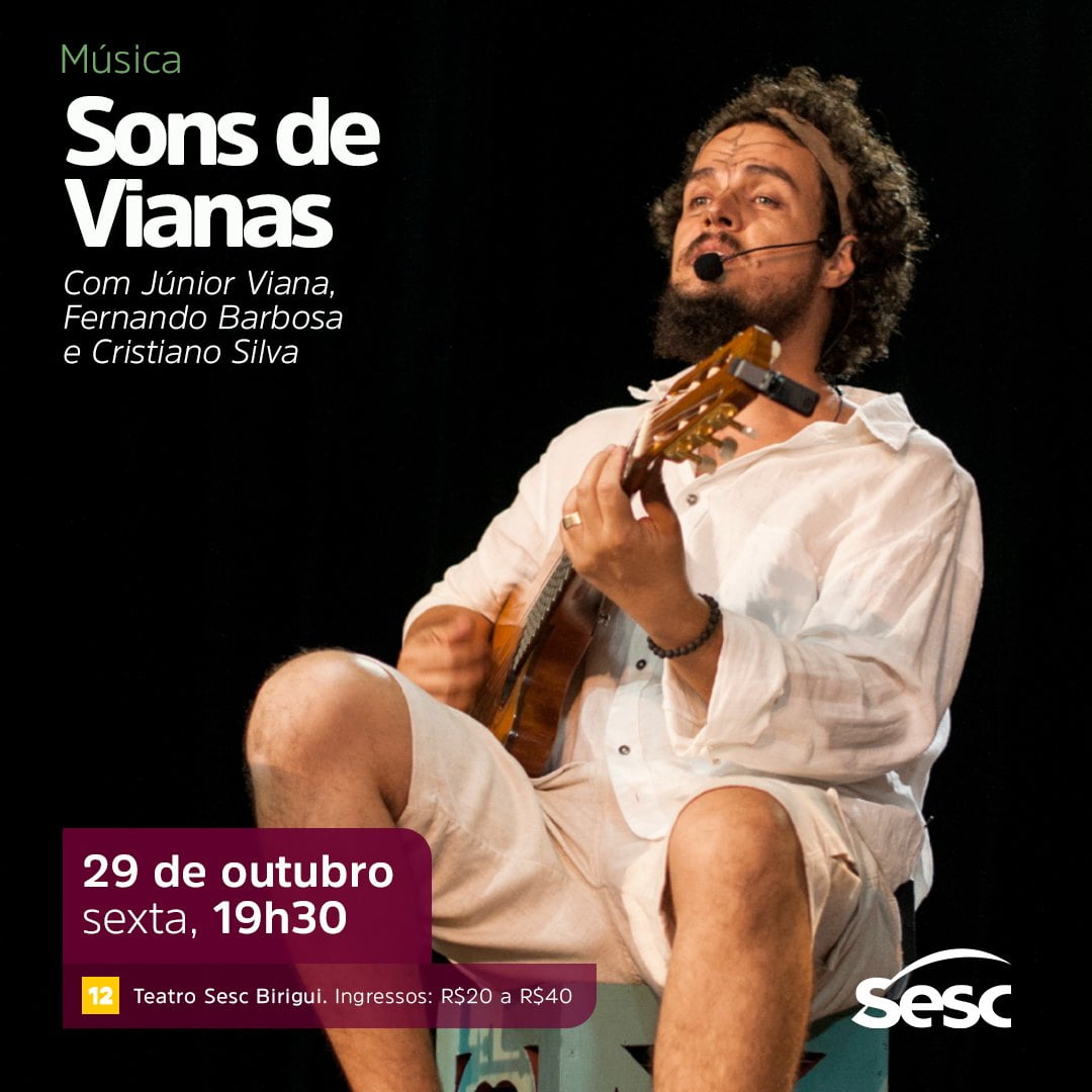 Reabrindo as apresentações no Teatro do Sesc Birigui, o palco recebe o show “Sons de Vianas”. Na apresentação, o cantor e compositor Júnior Viana interpreta algumas de suas canções e de outros Vianas, como: Djavan Caetano Viana, Caetano Veloso Viana e Herbert Viana.