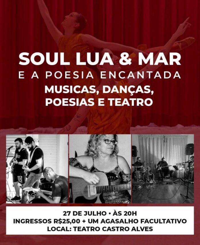 No último sábado de julho, o teatro Castro Alves será o palco do espetáculo Soul Lua & Mar e a Poesia Encantada, uma celebração de músicas poéticas que marcaram época nas rádios. O repertório inclui interpretações de artistas como Zé Ramalho, Zeca Baleiro, Chico César, Ney Matogrosso, Maria Bethânia, Roberto Frejat, Tim Maia, Elza Soares, Sandra de Sá e outros renomados nomes da música brasileira.
