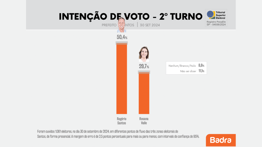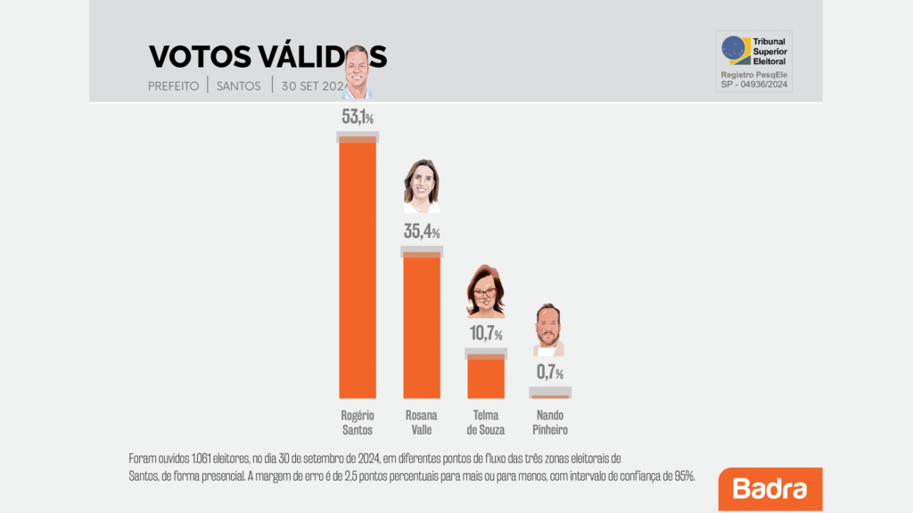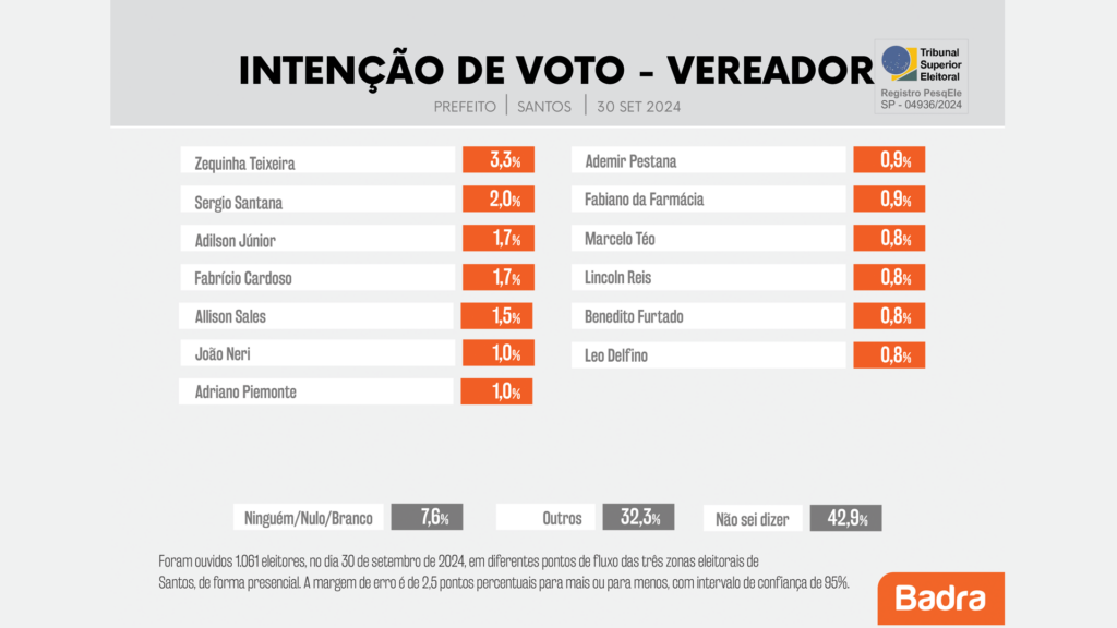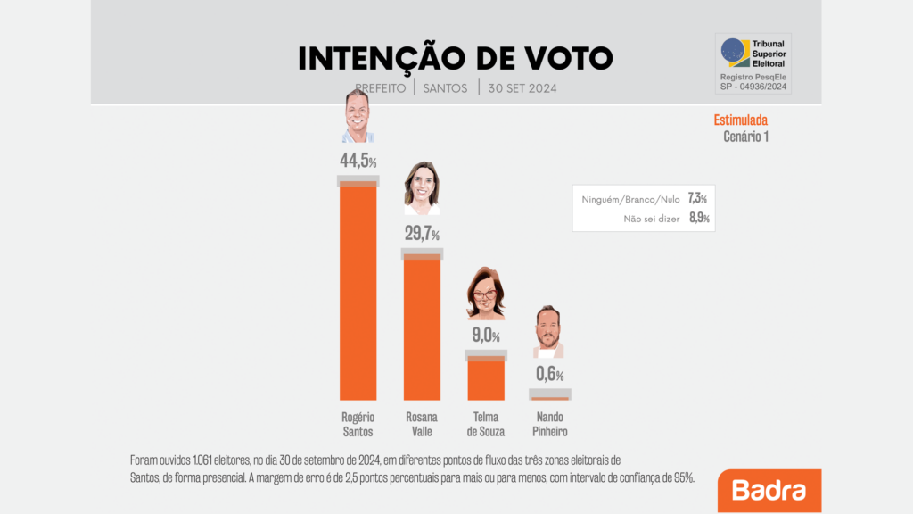 O Instituto Badra divulgou, com exclusividade na TV Thathi Band Litoral, as intenções de voto para a Prefeitura de Santos, nesta terça-feira (01). A pesquisa está registrada no Tribunal Superior Eleitoral sob nº SP-04936/2024. Os dados foram coletados no dia 30 de setembro, com 1060 eleitores da cidade.