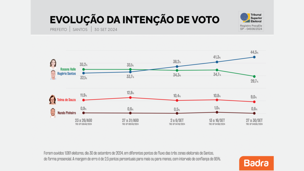 Sobre a Evolução da Intenção de Voto, desde o início das pesquisas, no dia 23 de agosto, até a presente data. Rosana Valle que iniciou com 35,2%, aparece agora com 29,7% dos votos. Rogério Santos, iniciou com 32,1% e aparece agora com 44,5%. Telma de Souza, iniciou com 11,9% e aparece agora com 9,0%, e Nando Pinheiro, iniciou com 0,9% e aparece agora com 0,6%.