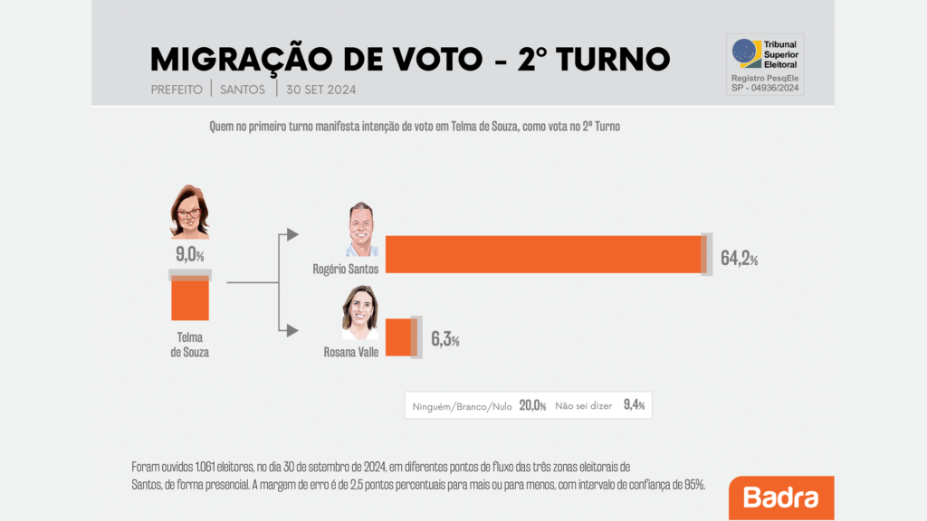 Na pesquisa de intenção de voto de um possível 2º turno, aos que manifestaram intenção de voto em Telma de Souza, 64,2% votariam em Rogério Santos e 6,3% em Rosana Valle. Votariam em ninguém/branco/nulo 20,0%, e não souberam dizer 9,4%.