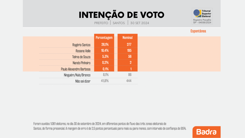 Na espontânea, 41,8% das pessoas não souberam responder em quem irão votar nas Eleições 2024, e 8,1% irão votar ninguém/branco/nulo. Rogério Santos aparece com 26,1%, Rosana Valle vem em seguida, com 18,4%, Telma de Souza, com 5,3%, Nando Pinheiro, com 0,2%, e Paulo Alexandre Barbosa com 0,1%.
