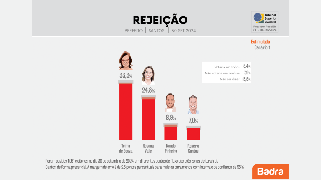 Nas pesquisas de Rejeição, 13,5% das pessoas não souberam dizer, 7,2% não votariam em nenhum, e 5,4% votariam em todos. Telma de Souza aparece com 33,3%. Rosana Valle vem logo atrás, com 24,8%, Nando Pinheiro, com 8,9%, e Rogério Santos, com 7,0%.