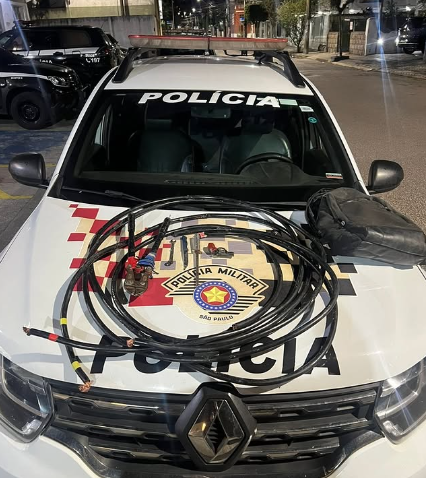 Dois homens foram presos após ser capturados em flagrante pela Polícia Militar por roubo de fios de energia em uma agência bancária localizada na Avenida Jovino de Mello, na Zona Noroeste, em Santos.