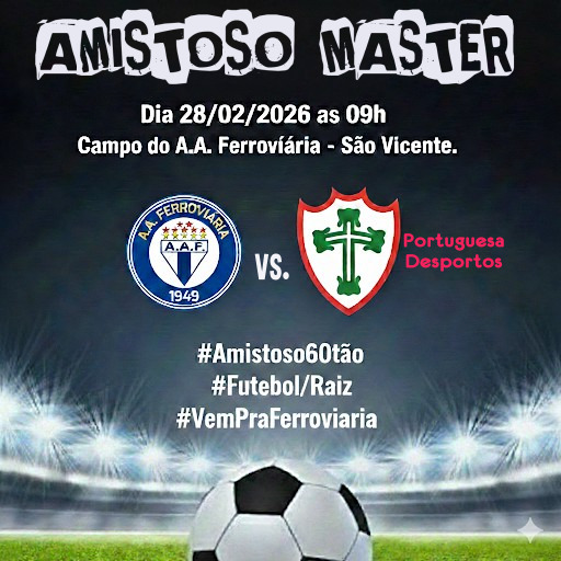 No próximo sábado (28), às 9h da manhã, no Campo da Ferroviária, em São Vicente, acontecerá um amistoso festivo da categoria 60tão. O confronto colocará a Ferroviária e a tradicional equipe da Portuguesa de Desportos frente a frente.