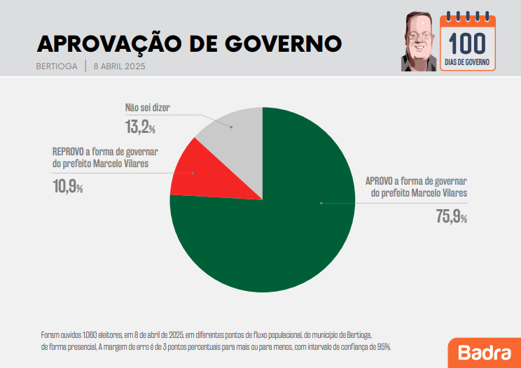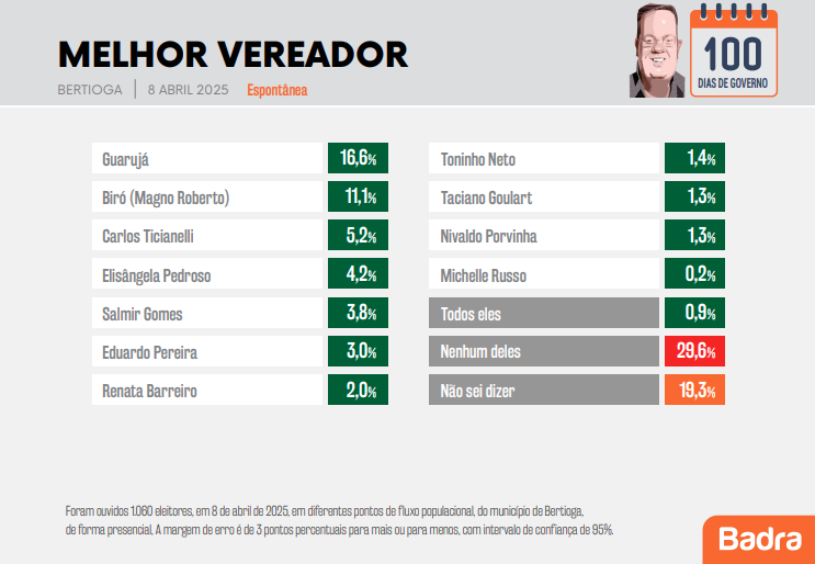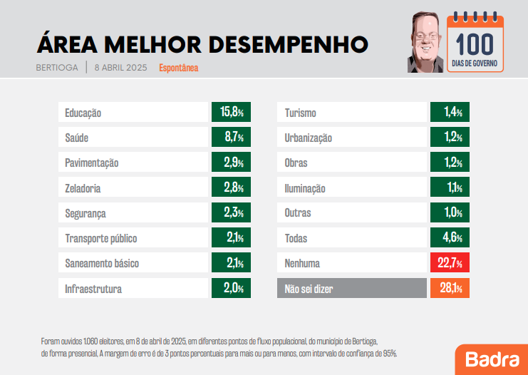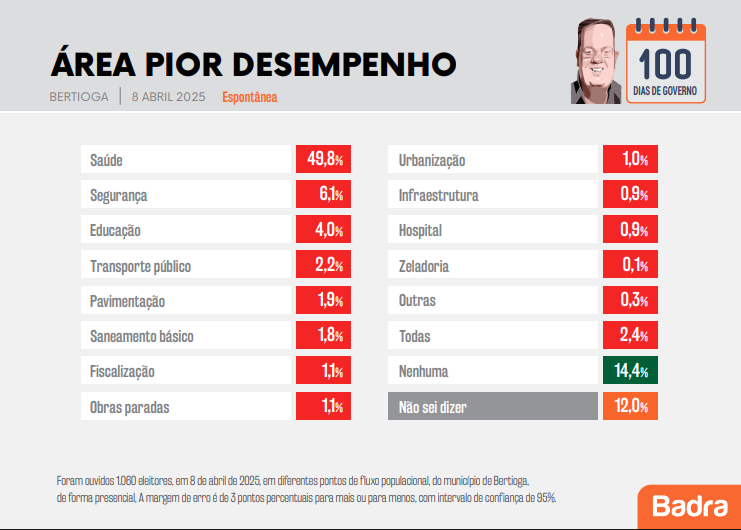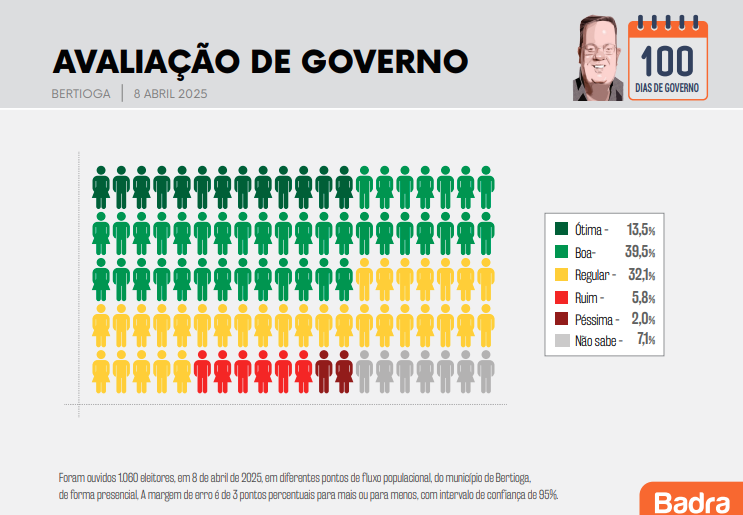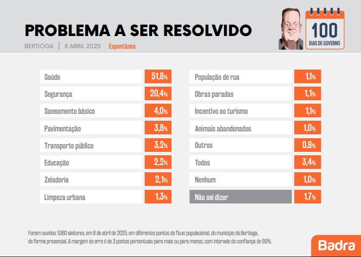 Os números são da mais recente pesquisa Badra de opinião, realizada ontem, dia 8, e que ouviu 1.060 moradores em diferentes pontos de fluxo da cidade. Bertioga abre a rodada do levantamento intitulado “100 Dias de Governo”, que vai percorrer os nove municípios da Baixada Santista.