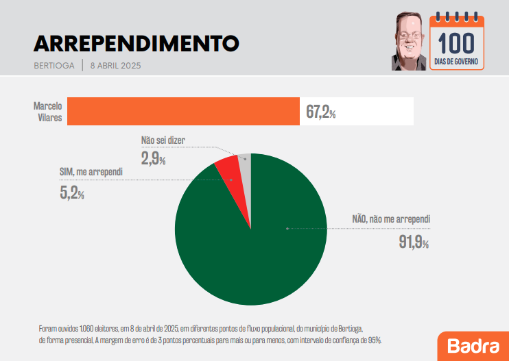 O levantamento realizado pela Badra ouviu 1.060 moradores-eleitores de Bertioga na terça-feira, dia 8. A margem de erro é de três pontos percentuais para mais ou para menos, com intervalo de confiança de 95%. A amostra, em termos de perfil, segue a proporção de eleitores presentes no universo (total de eleitores do município) para as variáveis gênero, faixa etária, renda e escolaridade, com a aplicação de fator de ponderação para as duas últimas variáveis, quando necessário. A técnica de pesquisa é a não probabilística por cotas.