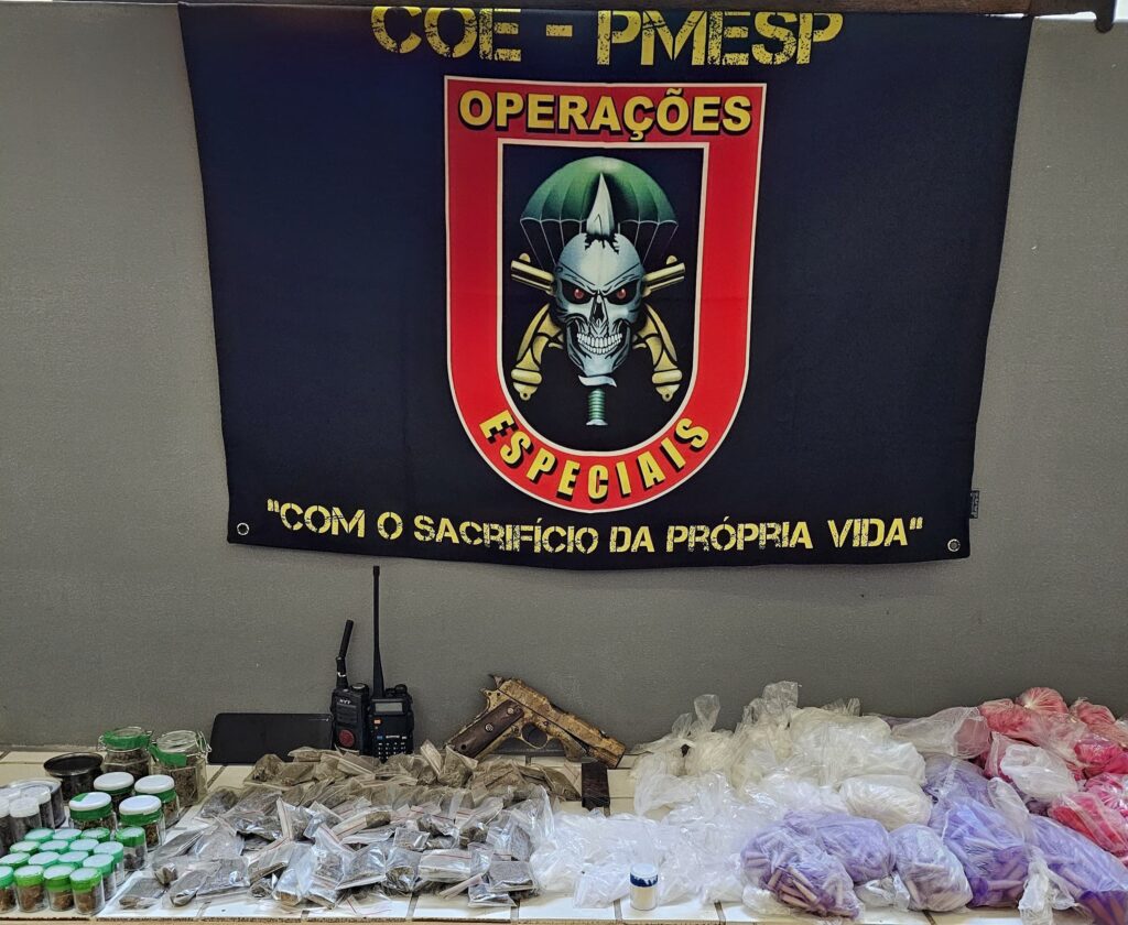 Na região, também foram encontrados 3,6 mil pinos de cocaína, 170 pedras de crack, 77 papelotes de skunk e 86 de maconha, além de celular e rádios comunicadores.