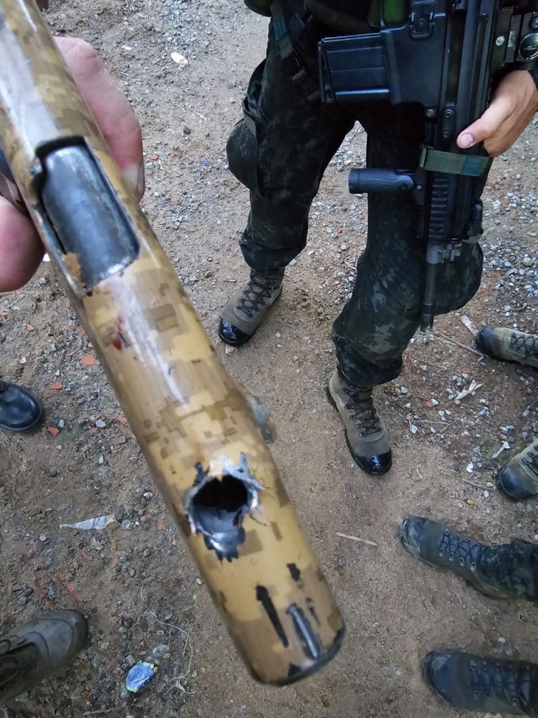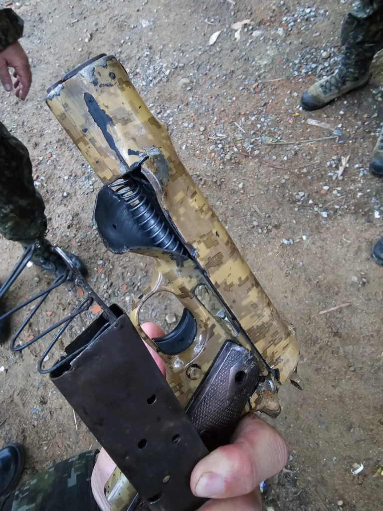 A equipe seguiu com as buscas conseguiu localizar uma das armas, calibre .45, usada para atacar os policiais. O tiro disparado pelo agente acertou o cano da pistola, destruindo o armamento.