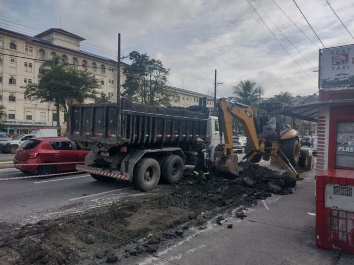 Uma escavação junto ao meio-fio da Avenida Cláudio Luiz da Costa, sentido Centro, na cidade de Santos, litoral paulista, foi iniciada nesta terça-feira (28), preparando a área para o assentamento de tubulações que vão melhorar o sistema de drenagem de águas pluviais.