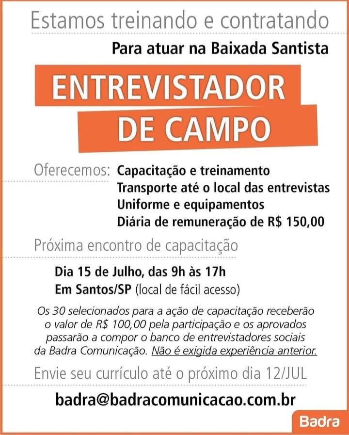 A vaga é para entrevistador de campo e 30 pessoas serão selecionadas para uma ação de capacitação. Os aprovados irão ao banco de entrevistadores sociais. Não é necessário experiência.