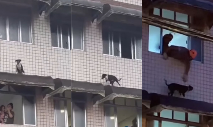 Um cachorro precisou ser socorrido pelo Corpo de Bombeiros após cair da janela do 3º andar, e ficar ‘ilhado’ no toldo de um prédio residencial no bairro Boqueirão, na cidade de Praia Grande, litoral de São Paulo.