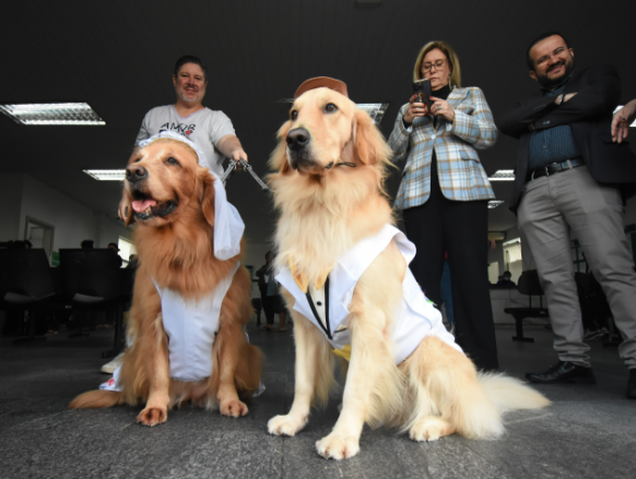 Amor em forma de pelos. Com muito afeto, os cães terapeutas Brioza e Jabuca estiveram na Unidade de Pronto-Atendimento (UPA) Quietude nesta quarta-feira (11) para levar alegria aos pacientes e funcionários. Vestidos com roupas com motivos juninos, os Golden Retriever deram e ganharam muito carinho, posaram para fotos e aqueceram a manhã fria em Praia Grande.